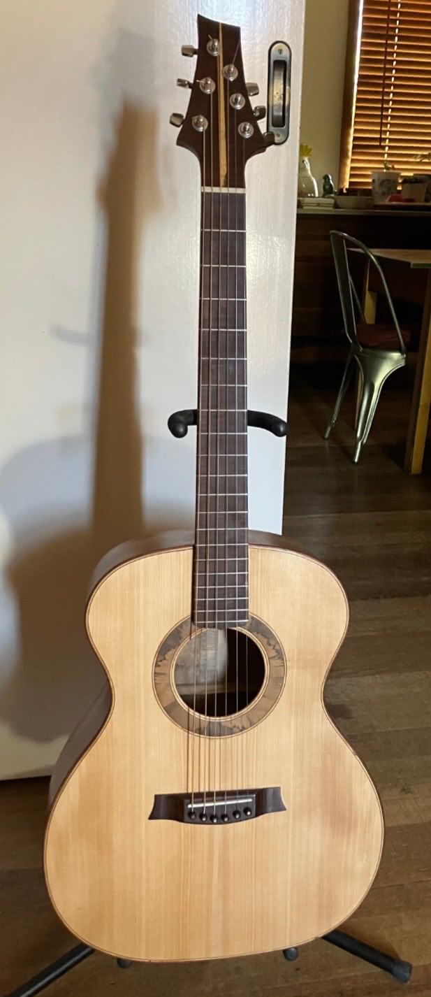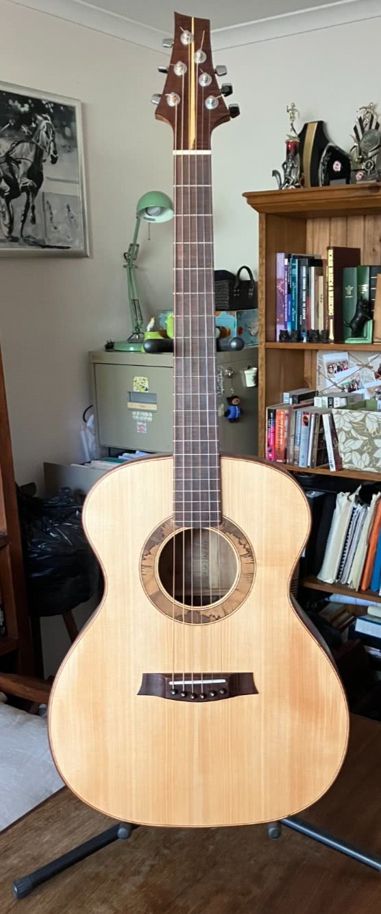 Back and sides Tasmanian Blackhearted Sassafras, Soundboard Tasmanian old growth Blackwood. In the words of the customer: the best guitar he had ever played, the sound is absolutely amazing, it rings on for ages. I can't believe what an incredible instrument it is. Mark Bailey, the luthier in Scotland that does the luthier course, said that he had not heard a brand new guitar sound so good.