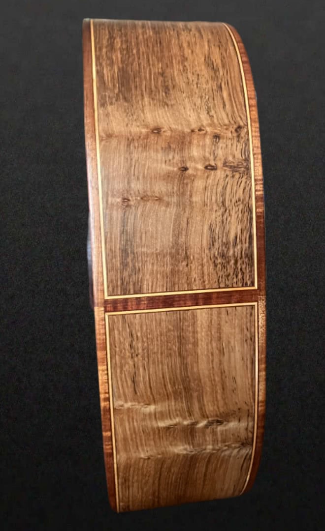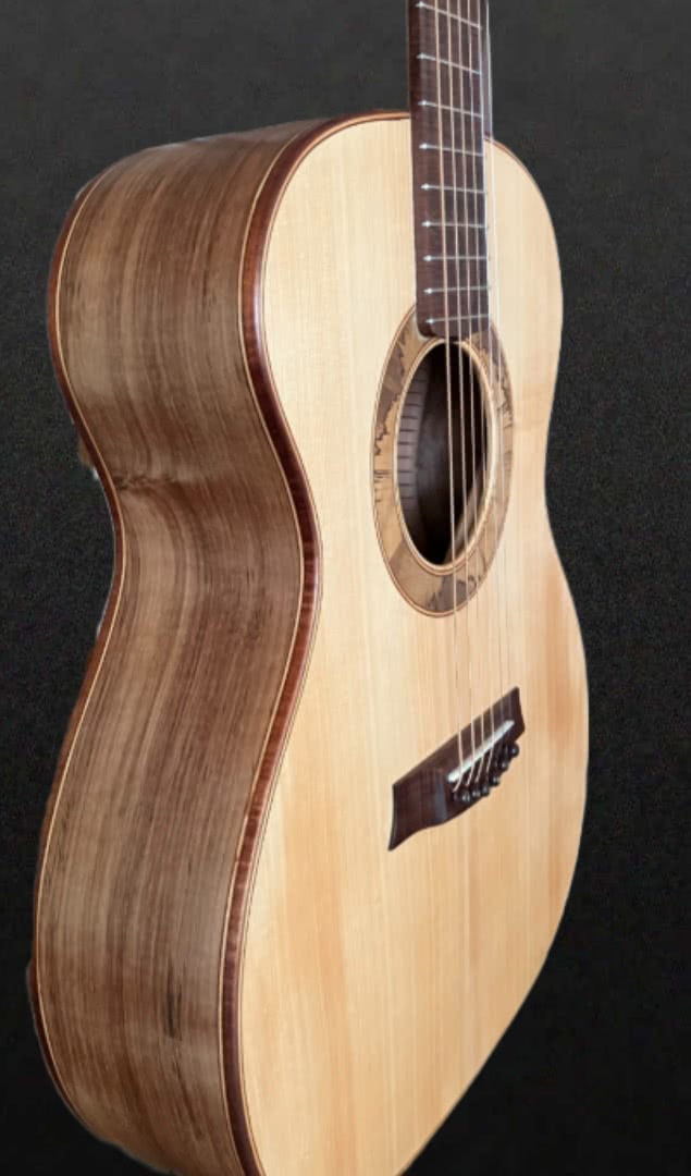 Back & Sides Tasmanian Eucalyptus -Pickguard Tasmanian fiddleback blackwood – Bindings Tasmanian Myrtle